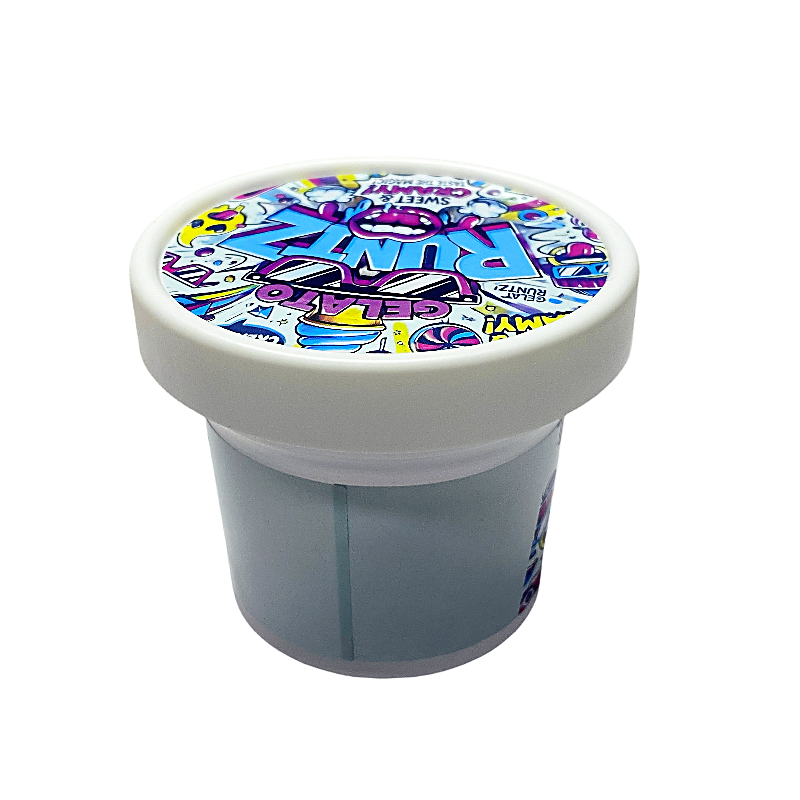 Ice cream pint style containers designed with decorative wrap labels for a bold and unique appearance.